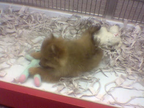 A Pomeranian in a cage playing with a toy. Photo credit: openverse.com